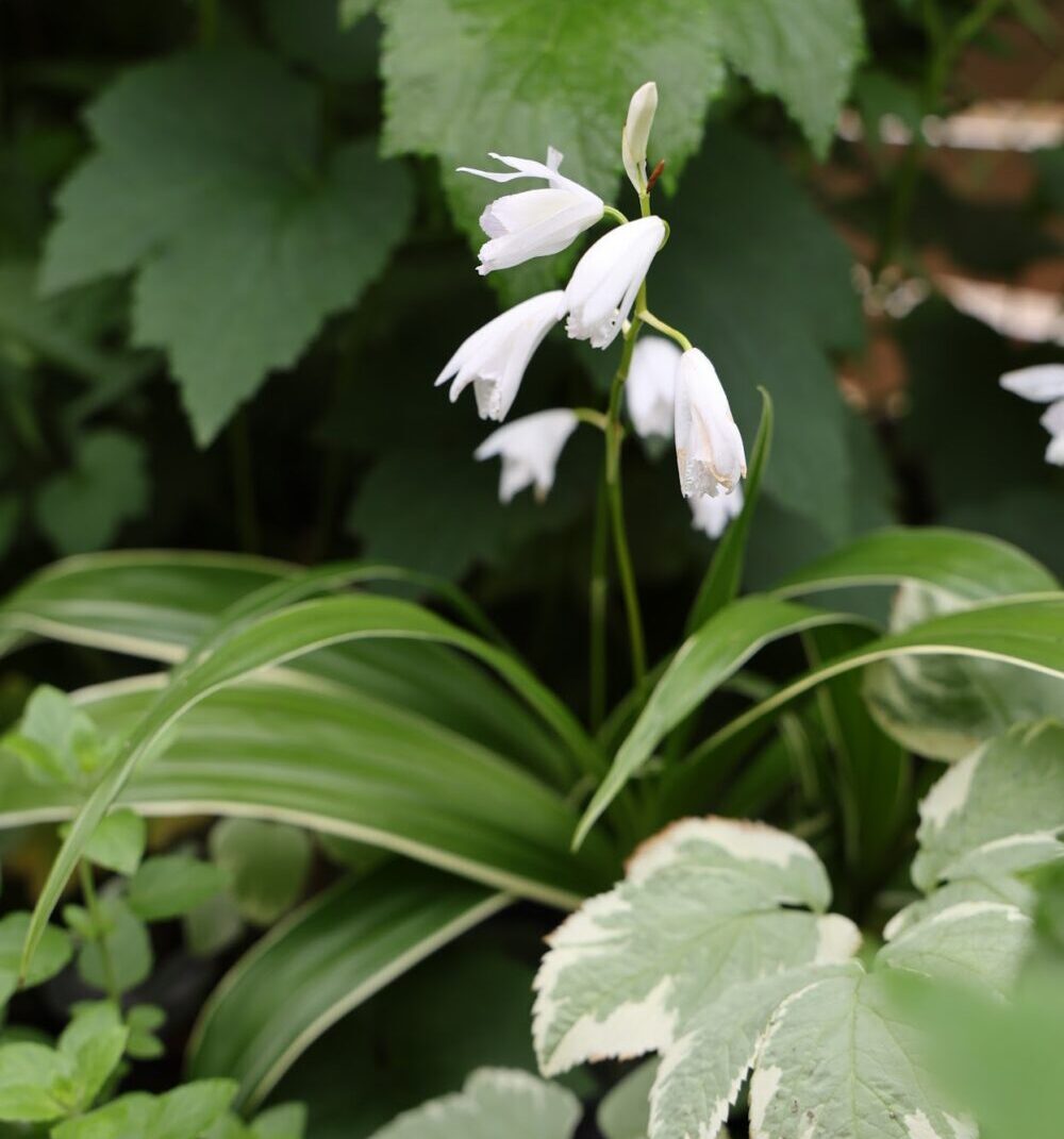 白い花を咲かせるシランの斑入り葉品種
