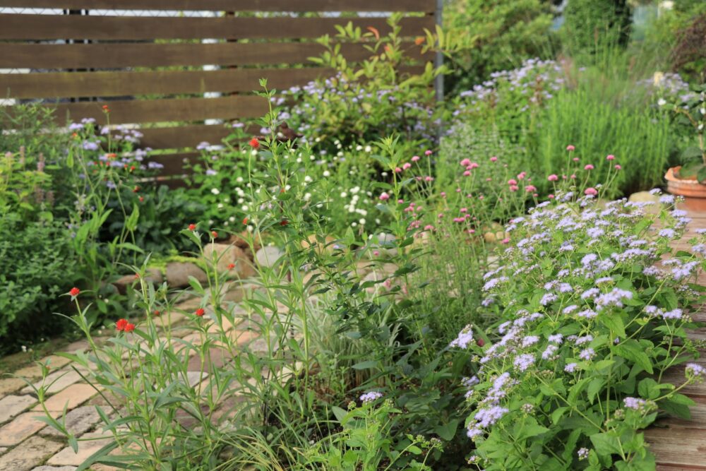 ユーパトリウム・セレスチナムは、キク科の宿根草。アゲラタムに似た花を、初夏から秋まで途切れることなく咲かせます。