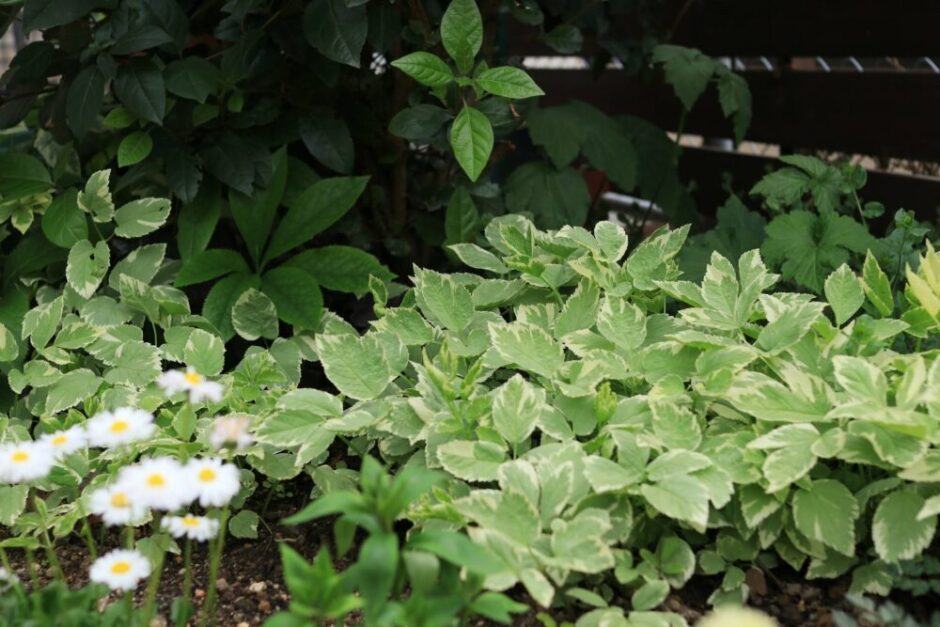 エゴポディウム・バリエガタは、斑入り葉が美しい耐寒性多年草(宿根草)。落葉性で冬は地上部を枯らして越冬します。